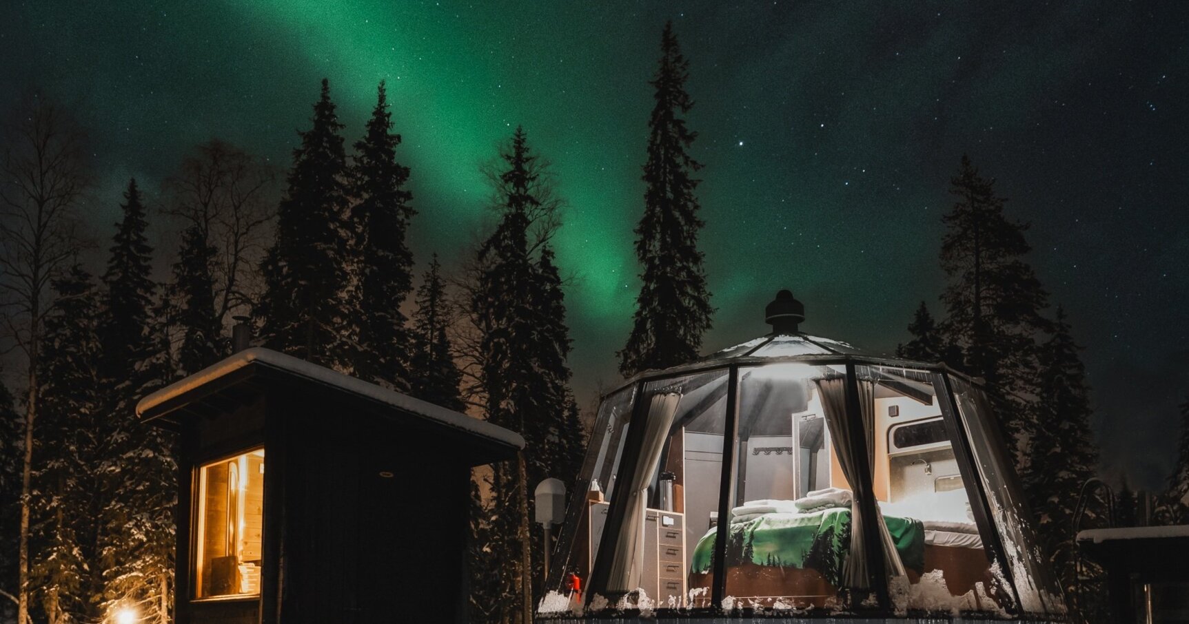 The hotel consists of 12 Scandinavian style Aurora Hut glass igloos with wood-burning saunas, a reception building, a cozy open-fire restaurant, Stella Nova Flame, and facilities for our own, exclusive Arctic activities. The location is a quiet and isolated place in the middle of beautiful forest, between the Ounasjoki river and Nuuksvaara hill, about 15km away from the Rovaniemi city area.