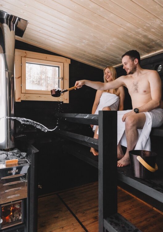 All the Aurora huts on land have private saunas next to the hut and the huts on the river have a shared sauna which you can reserve just for your use. The huts are equipped with bathrobes and slippers that you can use when walking to the sauna and back.